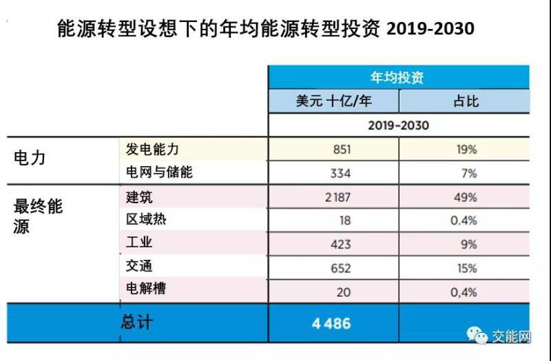 表中將可再生能源和能源效率方面所需的全球投資分解為幾個(gè)主要組成部分。2019年至2030年,每年44860億美元,相當(dāng)于2019年全球GDP的近5.4%。