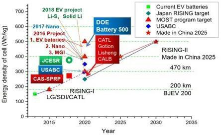4.1 中國發(fā)展規(guī)劃:中國現(xiàn)在是全球發(fā)表電池研究論文最多的國家。但同時在工業(yè)界也定義了兩個并行的研究和創(chuàng)新戰(zhàn)略:進化戰(zhàn)略和創(chuàng)新戰(zhàn)略。進化戰(zhàn)略專注于優(yōu)化現(xiàn)有搭載新能源電池的車輛和能源動力總成系統(tǒng),包括電池性能的提升(高安全,快速充電,低耗電量等)。而革命性戰(zhàn)略的目標(biāo)是開發(fā)下一代電池化學(xué)體系用于車輛動力總成系統(tǒng)。如圖9所示,可以比較2015年至2035年中國的電池發(fā)展目標(biāo)與日本新能源產(chǎn)業(yè)的技術(shù)綜合開發(fā)機構(gòu)(NEDO)的RISING計劃目標(biāo),以及美國能源部(DOE)的Battery 500計劃。