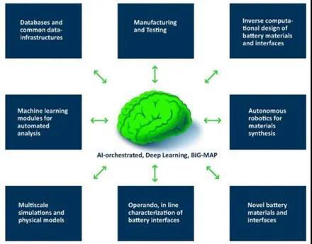 從能源技術(shù)的生產(chǎn),存儲到最終交付使用,材料的發(fā)現(xiàn)和開發(fā)始終貫穿于整個過程。特別對于新興的電池技術(shù),先進材料幾乎是所有清潔能源創(chuàng)新的基礎(chǔ)。若依靠現(xiàn)有的傳統(tǒng)重復(fù)性試驗開發(fā)過程,需要耗費大量的時間,人力物力去開發(fā)新型高性能電池材料并用于電池設(shè)計,這一過程從最初發(fā)現(xiàn)到完全實現(xiàn)商業(yè)化可能長達10年之久。因此,在《電池2030+》項目中,為了加速超高性能的,可持續(xù)發(fā)展的智能型電池開發(fā),計劃在歐洲范圍內(nèi)設(shè)立電池“材料加速平臺(MAP)”,并與電池界面基因組(BatteryInterface Genome,BIG)集成在一起。同時BIG-MAP基礎(chǔ)設(shè)施模塊化設(shè)置,全系統(tǒng)具有高度的通用性,以便能夠容納所有新興的電池化學(xué)體系,材料成分,結(jié)構(gòu)和界面。另一方面,MAP將利用人工智能(AI)從許多互補的方法和技術(shù)中集成和編排數(shù)據(jù),整合計算材料設(shè)計,模塊化和自主性綜合機器人技術(shù)和先進表征,實現(xiàn)全新的電池開發(fā)策略。促進材料,工藝和設(shè)備的逆向設(shè)計和定制。最終,在MAP框架下由每個核心元素構(gòu)建概念電池,開發(fā)出具有突破性的電池材料,極大提高電池開發(fā)速度和電池性能。