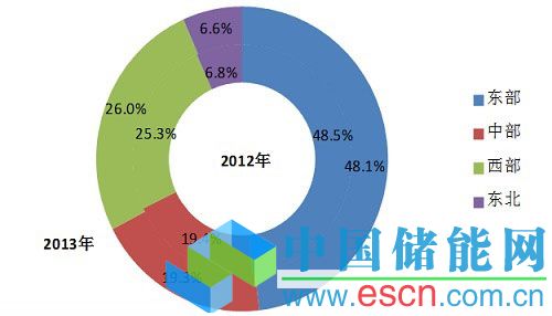 圖2 2012、2013年全國分地區(qū)電力消費結(jié)構(gòu)圖