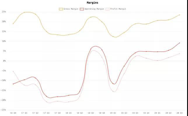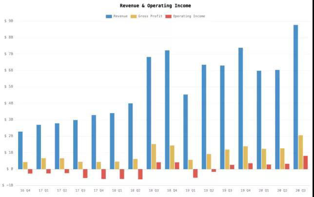 Q3季度特斯拉總營(yíng)收為87.71億美元,環(huán)比增長(zhǎng)45%,同比增長(zhǎng)39%,疫情影響過去后,工廠恢復(fù)全速生產(chǎn),使得整體業(yè)務(wù)狀況非常良好;毛利潤(rùn)為20.63億美元,環(huán)比增長(zhǎng)63%,同比增長(zhǎng)73%,說(shuō)明特斯拉在生產(chǎn)和經(jīng)營(yíng)的成本控制還在提升;營(yíng)業(yè)利潤(rùn)為8.09億美元,環(huán)比增長(zhǎng)147%,同比增長(zhǎng)210%,大幅上漲的營(yíng)業(yè)利潤(rùn)證明了整體特斯拉的經(jīng)營(yíng)和銷售的方向是正確的,隨著銷量進(jìn)一步提升將會(huì)更加明顯。