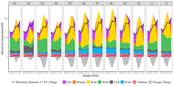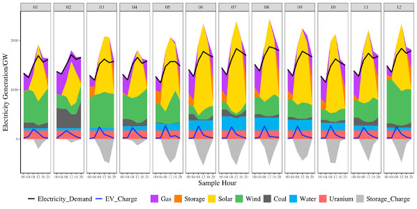 圖5. “C70-電動汽車激進(jìn)發(fā)展規(guī)模-無序充電”場景下2050年的電網(wǎng)調(diào)度結(jié)果. 調(diào)度結(jié)果包含12個月中任意一天中的6個采樣時間點(diǎn)的調(diào)度值。
