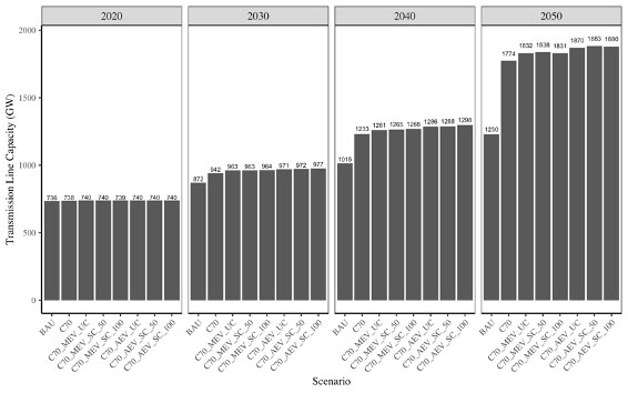 C70場景下2050年的電網(wǎng)輸電線路容量比BAU場景中高出約44%,達(dá)到了17.74億千瓦。這表明加大電網(wǎng)基礎(chǔ)設(shè)施投資,能夠提高系統(tǒng)靈活性,中國電網(wǎng)能夠在更大的范圍內(nèi)平抑高比例可再生能源的區(qū)域性波動。