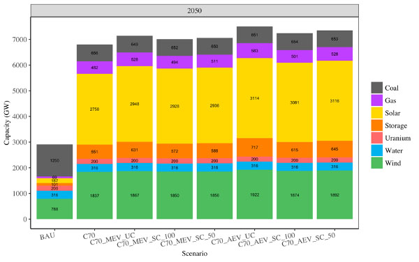 圖2.2050年電力系統(tǒng)累計(jì)裝機(jī)情況.“C70-AEV-SC-100”場景表示碳排放采用“低于2℃”、電動汽車規(guī)模采用激進(jìn)發(fā)展規(guī)模、充電方法采用智能充電(UC表示無序充電)、100表示參與智能充電的電動汽車占比為100%。