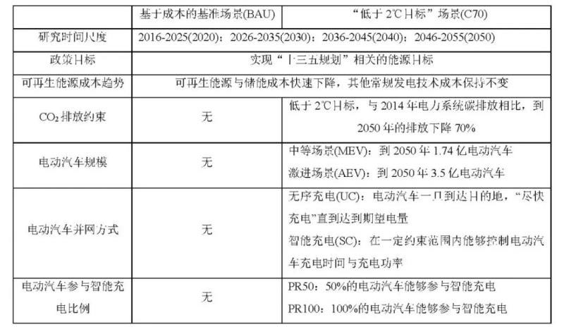 根據(jù)IEA報告,C70場景下,電力系統(tǒng)碳排放需從2014年的44億噸左右降到2050年的13億噸左右。同時在C70場景中包含了不同電動汽車規(guī)模、不同并網(wǎng)方式與不同參與度的場景。其中,在高比例電動汽車激進(jìn)場景中,電動汽車?yán)塾?jì)保有量到2050年將達(dá)到3.5億輛,占預(yù)測汽車保有量的比例56%左右。電動汽車并網(wǎng)方式包括無序充電與智能充電兩種,無序充電方式為不可控充電模式,表示電動汽車一旦到達(dá)目的地,“盡快充電”直到達(dá)到期望電量。智能充電為可控模式,表示“延時充電”策略,在一定約束范圍內(nèi)能夠控制電動汽車充電時間與充電功率。參與度表示電動汽車能夠參與有序充電的比例,場景解釋如表1所示。