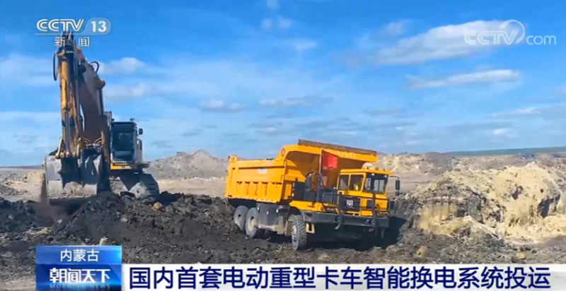 在內(nèi)蒙古伊敏煤電的露天礦,31臺電動重型卡車正在忙碌地作業(yè)著。這個方盒子就是給這些重型卡車換電的智能換電站,每4分鐘就能換上一塊電池,一塊電池能讓卡車跑上35公里,來回運送四五趟的土方。
