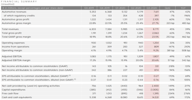 當(dāng)?shù)貢r(shí)間10月21日,特斯拉發(fā)布了2020財(cái)年第三季度業(yè)績(jī)報(bào)告。報(bào)告顯示,特斯拉報(bào)告期內(nèi)營收同比增長(zhǎng)39%至87.71億美元,實(shí)現(xiàn)有史以來最高的季度收入水平,凈利潤(rùn)為3.31億美元,同比增長(zhǎng)131%。