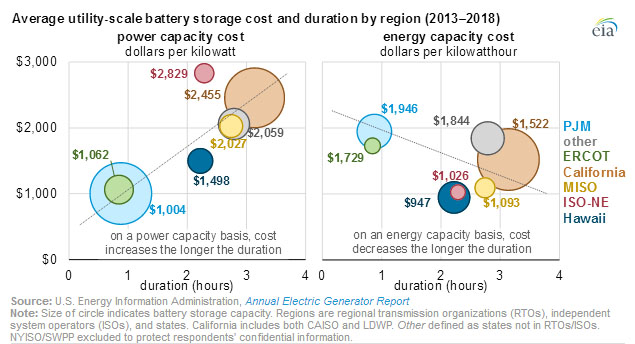 電池儲能系統(tǒng)的部署成本因地區(qū)和應用場景而異。美國的電力系統(tǒng)主要由獨立系統(tǒng)運營商(ISO)和區(qū)域輸電組織(RTO)管理和運行。為了了解電池儲能系統(tǒng)成本如何根據(jù)部署的位置而發(fā)生變化,美國能源信息管理局(EIA)將加利福尼亞州的獨立系統(tǒng)運營商(ISO)和區(qū)域輸電組織(RTO)匯總在一起,以避免在電池儲能系統(tǒng)部署較少的地區(qū)披露受訪者的機密信息。在區(qū)域市場層面,2013年至2018年的電網(wǎng)規(guī)模電池儲能系統(tǒng)的平均成本各不相同,例如PJM互聯(lián)公司的成本為1946美元/ kWh,而夏威夷電力公司的成本為947美元/ kWh。