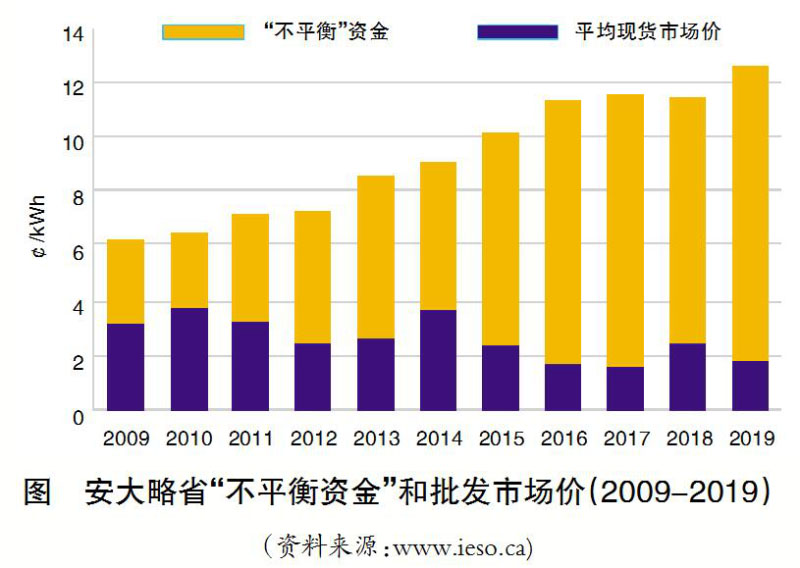 隨著優(yōu)先購電合同電量的增加、安省電力監(jiān)管方式的改變(比如用“優(yōu)先發(fā)電”替代“市場(chǎng)力控制協(xié)議”)以及安省現(xiàn)貨市場(chǎng)價(jià)格逐年下降,安省“優(yōu)先購電”和“優(yōu)先發(fā)電”價(jià)格與現(xiàn)貨市場(chǎng)價(jià)逐漸拉開,“不平衡資金”開始由盈轉(zhuǎn)虧,且規(guī)模越來越大。如下圖所示,在2009年,批發(fā)市場(chǎng)價(jià)為0.155元/千瓦時(shí),不平衡資金約為0.16元/千瓦時(shí)。但到2019年,批發(fā)市場(chǎng)價(jià)則下降為0.09元/千瓦時(shí),而不平衡資金價(jià)格上升到了空前的0.64元/千瓦時(shí)。2019年的“不平衡資金”達(dá)到驚人的約650億元,是同年市場(chǎng)電費(fèi)的6倍以上。