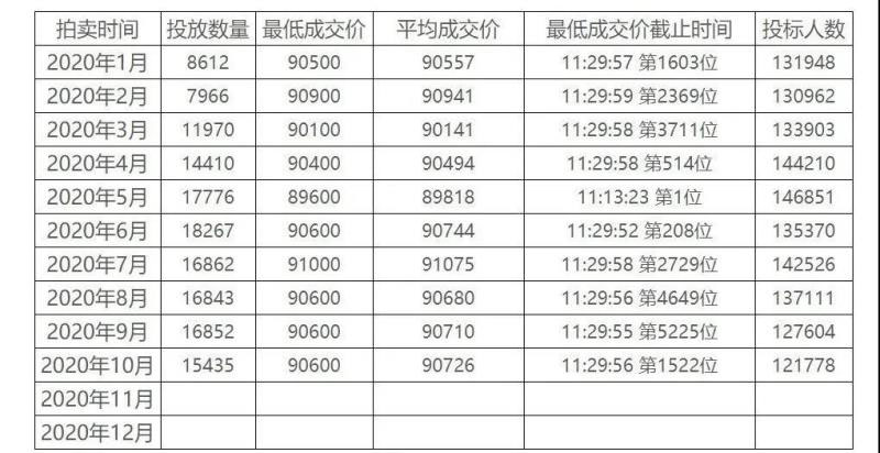 上海市公布的信息顯示,10月份燃油車滬牌合計拍賣總數(shù)15435輛,其中個人額度投放14000輛;參加拍賣人數(shù)121778人,中標率12.7%。拍賣總數(shù)和中標率相比9月的16852輛和13.2%有所下滑。