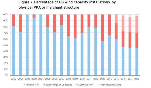 圖一顯示出美國風電裝機容量按不同遠期市場類型所占的百分比,受可再生能源配額制的影響,傳統(tǒng)PPA歷史上一直占有主導地位,直到最近幾年,隨著可再生能源逐漸成為低成本資源,新的遠期市場參與形式(例如純商業(yè)化模式和虛擬購售電合同)才開始出現(xiàn)并不斷增長,而且內容條款也針對不同的需求表現(xiàn)得更個性化。