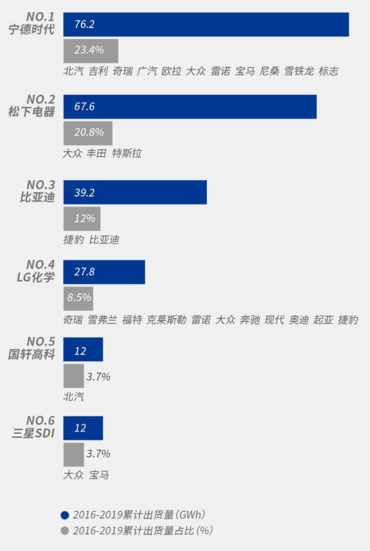 中國(guó)作為動(dòng)力電池的第一生產(chǎn)大國(guó),從2016至2019連續(xù)4年動(dòng)力電池出貨量占據(jù)全球超過(guò)40%的市場(chǎng)份額,其中累積出貨量全球前五的企業(yè)中有三家來(lái)自中國(guó),是名副其實(shí)的“世界充電寶”。2019年全球動(dòng)力電池超過(guò)85%的出貨量和產(chǎn)能集中在中國(guó)、日本、韓國(guó)三國(guó),形成東亞“三國(guó)鼎立”的市場(chǎng)布局。目前動(dòng)力電池生產(chǎn)商第一梯隊(duì),被寧德時(shí)代(中國(guó))、松下電器(日本)、LG化學(xué)(韓國(guó))等企業(yè)包攬全球前十強(qiáng)。