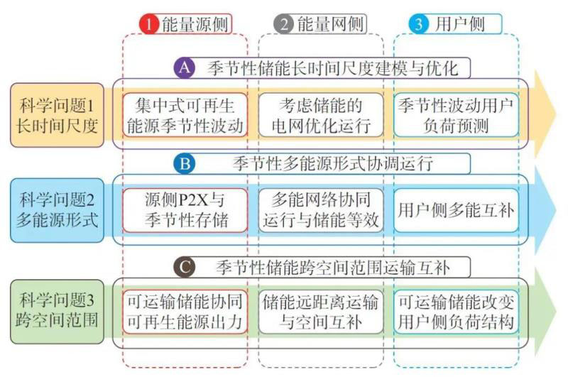 季節(jié)性?xún)?chǔ)能與短期儲(chǔ)能存在較大差異,其具備長(zhǎng)時(shí)間尺度、多能源形式與跨空間范圍的3個(gè)關(guān)鍵特征,其研究中的關(guān)鍵科學(xué)問(wèn)題可以總結(jié)為以下3個(gè)方面,如圖3所示。