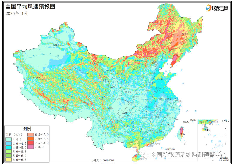 附圖3 全國2020年11月平均風(fēng)速分布預(yù)報圖