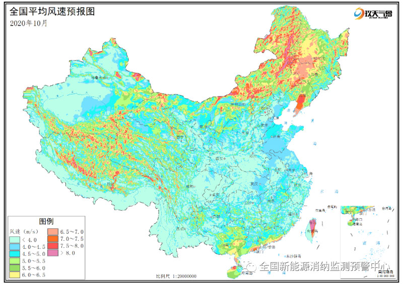 附圖1 全國2020年10月平均風(fēng)速分布預(yù)報圖