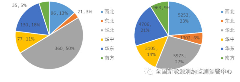 三季度各區(qū)域新增(左)、累計(右)并網(wǎng)光伏發(fā)電裝機(萬千瓦)