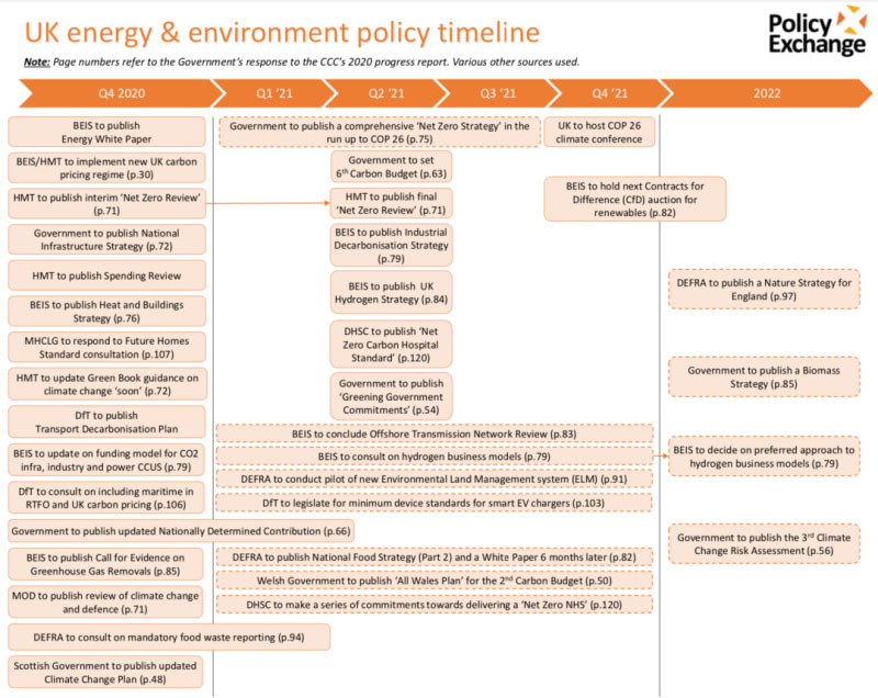 中國儲(chǔ)能網(wǎng)訊:根據(jù)PolicyExchange網(wǎng)站的匯總,未來12個(gè)月對(duì)于英國的能源和環(huán)境政策極為重要。如下圖所示,一個(gè)政府準(zhǔn)備在2021年11月在格拉斯哥舉行COP26氣候會(huì)議前后出臺(tái)多個(gè)能源環(huán)境相關(guān)的政策文件。