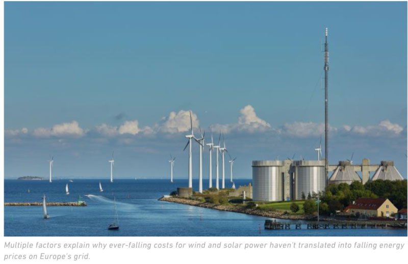 這里有幾個原因需要考慮。首先,可再生能源在整個歐洲發(fā)電量中所占的比例仍然相對較小。第二,最新的太陽能和風(fēng)能項目的LCOE下降幅度還沒有超過通過上網(wǎng)電價等支持機制補貼的既有的清潔能源電廠成本。另一種解釋是風(fēng)力發(fā)電廠和太陽能發(fā)電廠的可變產(chǎn)量必須通過礦物燃料發(fā)電機頻繁、快速的上下波動來平衡,這增加了電力成本和碳排放的上升。但還有另一個更重要的因素需要考慮:雖然低成本的可再生能源抵消了電網(wǎng)的一部分需求,但仍需要化石燃料發(fā)電廠設(shè)定電力市場的邊際成本。