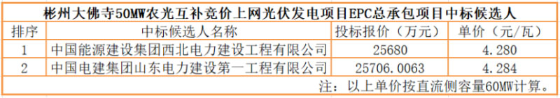 從公示中了解到,中國(guó)能源建設(shè)集團(tuán)西北電力建設(shè)工程有限公司以25680萬(wàn)元的投標(biāo)報(bào)價(jià),單價(jià)4.28元/瓦位列第一中標(biāo)候選人。