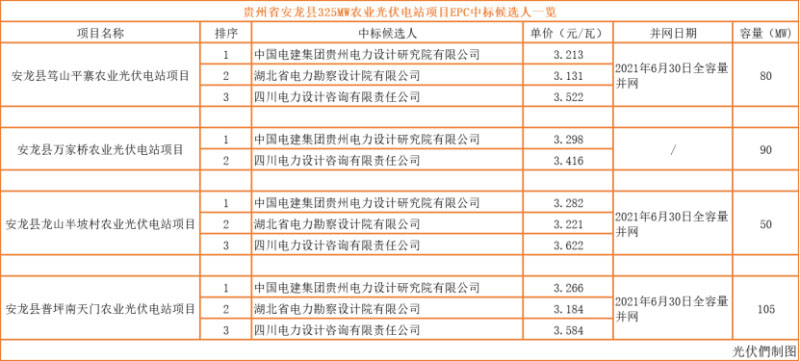 中國(guó)儲(chǔ)能網(wǎng)訊:11月4-5日,貴州省安龍縣四個(gè)農(nóng)業(yè)光伏電站項(xiàng)目EPC總承包工程中標(biāo)候選人公示,四個(gè)項(xiàng)目分別為安龍縣篤山平寨農(nóng)業(yè)光伏電站項(xiàng)目、安龍縣萬(wàn)家橋農(nóng)業(yè)光伏電站項(xiàng)目、安龍縣龍山半坡村農(nóng)業(yè)光伏電站項(xiàng)目、安龍縣普坪南天門(mén)農(nóng)業(yè)光伏電站項(xiàng)目;合計(jì)總?cè)萘繛?25MW。其中中國(guó)電建集團(tuán)貴州電力設(shè)計(jì)研究院有限公司分別以3.213元/瓦、3.298元/瓦、3.282元/瓦、3.266元/瓦,位列中標(biāo)候選人第一位。