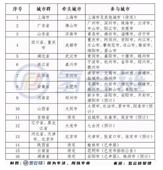 隨著截止日期的來臨,氫云鏈通過相關渠道咨詢與了解,掌握了全國各省、市燃料電池汽車示范城市群申報進展工作的最新進展,見表1: