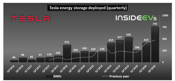 到了剛剛過去的2020年Q3,特斯拉儲能裝機(jī)量同比漲逾59%,以759MWh再創(chuàng)歷史新高。同時,自SolarCity被收購之后就一直下滑的太陽能業(yè)務(wù),竟也迎來了久違的同比增長,漲幅33%。