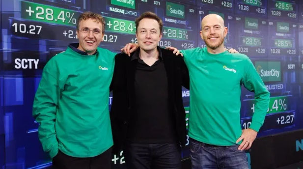 回到2004年,兩個曾與馬斯克共度童年的表兄弟,彼得·賴夫和林登·賴夫(Peter and Lyndon Rive),在賣掉自己創(chuàng)立的軟件公司后,正尋找新的“改變世界”的創(chuàng)業(yè)機(jī)會。馬斯克鼓動他們?nèi)ヌ剿魈柲苄袠I(yè),于是兩兄弟用2年時間學(xué)習(xí)知識、積累資源,并于2006年依靠馬斯克投入的1000萬美元創(chuàng)立了SolarCity公司,由馬斯克擔(dān)任董事長,林登·賴夫擔(dān)任CEO。