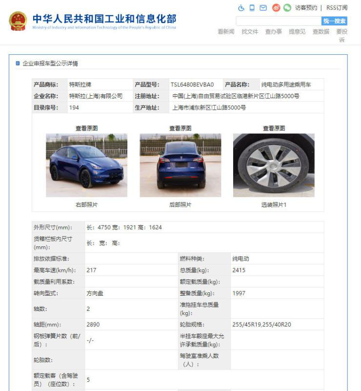 中國(guó)儲(chǔ)能網(wǎng)訊:11月5日,工信部發(fā)布《道路機(jī)動(dòng)車輛生產(chǎn)企業(yè)及產(chǎn)品公告》(第338批)的車輛新產(chǎn)品公示清單。特斯拉國(guó)產(chǎn)Model Y的信息在列,完成工信部申報(bào)。