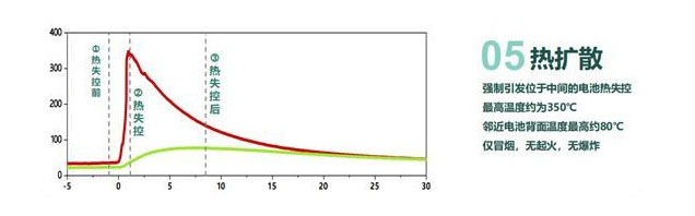 電芯強制熱失控,在刀片電池自我隔熱、阻燃系統(tǒng)的配合下,并沒有造成臨近電芯的熱失控。旁邊電芯最高溫度為80°C,并未達到磷酸鐵鋰電池熱失控的溫度條件。單個電芯的熱失控并沒有引發(fā)相鄰電芯的連鎖反應,因此整包電池的安全性能依舊。