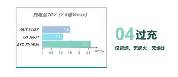 在過充測試中,比亞迪刀片電池以1倍率電流充電至終止電壓的2.6倍時終止充電,并且在1小時觀察期內(nèi)沒有出現(xiàn)起火、爆炸等現(xiàn)象。用更高的防過充標準降低由過充引發(fā)自燃的幾率,刀片電池讓新能源汽車的安全性能更上一層樓。