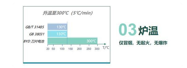 刀片電池使用磷酸鐵鋰材料,耐高溫性能更加優(yōu)異。爐溫測試中,刀片電池在超過國家標準要求溫度2倍多、達到300°高溫情況下保持30分鐘,期間沒有出現(xiàn)起火或者爆炸等現(xiàn)象。當遇到停車場相鄰車輛起火等狀況,刀片電池超強的耐高溫性能,能夠讓新能源汽車在高溫環(huán)境下最大限度保證電池安全。