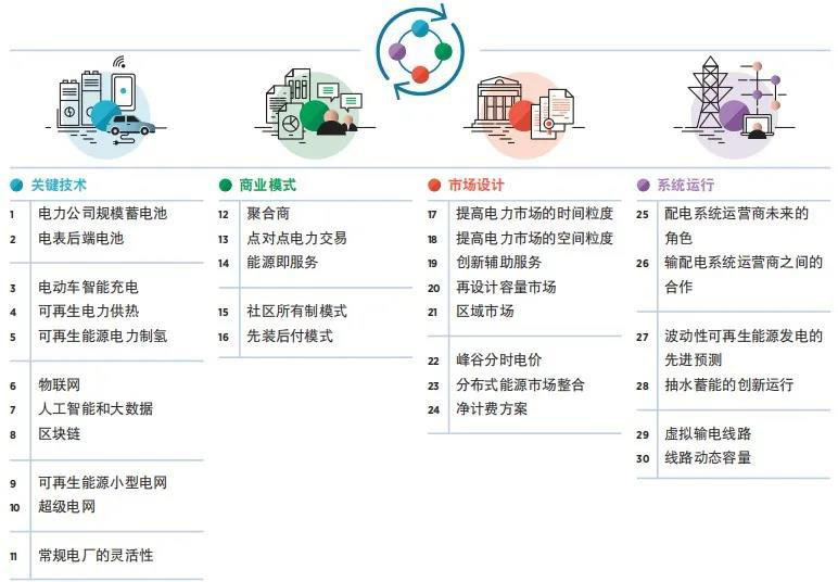 在解決 VRE 并網(wǎng)發(fā)電問題時(shí),我們并不缺乏創(chuàng)新。IRENA 對高比例 VRE 并網(wǎng)發(fā)電的創(chuàng)新舉措進(jìn)行了調(diào)研。通過調(diào)研分析找出了 30 種四大類電力行業(yè)轉(zhuǎn)型創(chuàng)新舉措:關(guān)鍵技術(shù)創(chuàng)新、商業(yè)模式創(chuàng)新、市場設(shè)計(jì)創(chuàng)新和系統(tǒng)運(yùn)行方式創(chuàng)新。