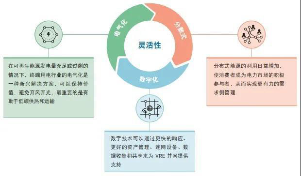 電氣化 、分布化 和 數(shù)字化 的結(jié)合正在加速電力行業(yè)的轉(zhuǎn)型 。這些領(lǐng)先的創(chuàng)新趨勢正在改變著電力系統(tǒng)的格局,為高 VRE 比例釋放系統(tǒng)靈活性,并改變著角色和責(zé)任,為電力行業(yè)的新興企業(yè)打開了大門。
