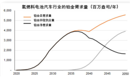 當然,上述需求的場景分析只是考慮了未來氫燃料電池汽車的產(chǎn)量、鉑載量和鉑金的回收率,但是還沒有考慮來自重型汽車的額外鉑金需求,以及本文中未作討論的其他燃料電池技術應用場景,譬如在接下來的幾十年里可能將發(fā)展起來的鐵路機車和航運船舶市場。