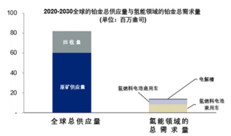 假設未來十年的開采量和回收量保持現(xiàn)有的水平,則2020至2030年期間鉑金的累計供應量可達到2500噸,或8200萬盎司。此供應量大約是上述來自電解水制氫和氫燃料電池汽車領域累計的鉑金需求量的6倍。