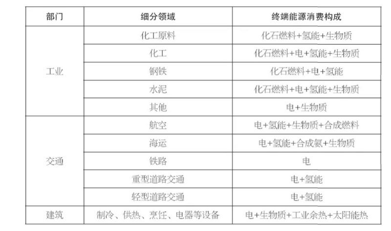 2.交通部門。為了實現(xiàn)我國交通部門的碳中和,需要將路面運(yùn)輸(公路和鐵路服務(wù))全面電氣化,同時長途航空和船運(yùn)改用零碳燃料(氫氣、氨等)。1)路面交通。目前,我國高鐵已基本實現(xiàn)了全面電氣化,普通速度的鐵路交通在未來也將逐步實現(xiàn)全面電氣化。純電動汽車將在未來主導(dǎo)中短距離的交通出行,而氫燃料電池汽車則會在長距離貨運(yùn)卡車和重型卡車中占據(jù)主要地位。2)航空和海運(yùn)。針對航空海運(yùn)領(lǐng)域,直接應(yīng)用電氣化實現(xiàn)碳中和的空間較小,因此,航空和海運(yùn)交通的脫碳則必須主要依靠零碳的新型燃料。對于航空領(lǐng)域,依靠生物航空燃油和合成航空燃油是實現(xiàn)碳中和的主要技術(shù)路徑。此外,未來需要使用生物燃料和氨對船運(yùn)領(lǐng)域進(jìn)行深度脫碳。綜上,零碳電能、氫能、航空燃油、生物燃料和氨等多種綜合能源的使用將會進(jìn)一步加速我國碳中和目標(biāo)的實現(xiàn)。