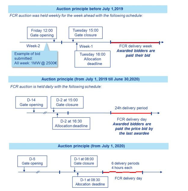 另一變化發(fā)生在2020年7月1日,因?yàn)轭l率控制(FCR)拍賣的時(shí)間表再次改變:市場參與者不再競拍24小時(shí)的產(chǎn)品,現(xiàn)在每天可以6次競拍4小時(shí)的交貨期。這種演變?yōu)槭袌鰠⑴c者提供了更大的靈活性,使他們能夠在同一天內(nèi)參與其他市場并使收入來源多樣化。因此,由于頻率控制(FCR)價(jià)格可能會(huì)反映市場狀況(白天價(jià)格較高,夜間價(jià)格較低),因此提高市場透明度。