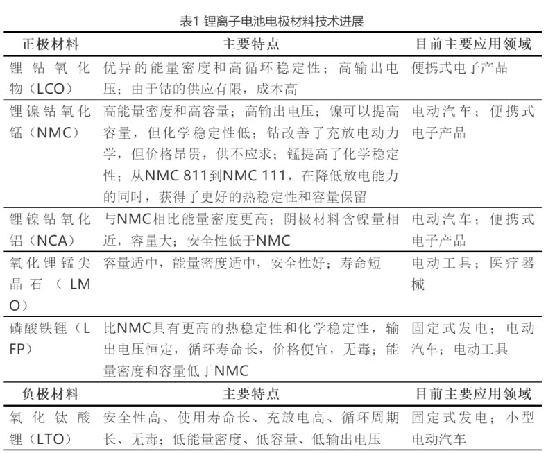 (1)鋰離子電池電極材料技術(shù)進(jìn)展情況。自2000年以來,鋰離子電極材料相關(guān)專利申請(qǐng)數(shù)量一直穩(wěn)定增長(zhǎng)。2010-2013年間,從355件增加到近900件。到2018年,約40%電極專利均涉及鋰離子技術(shù)。鋰離子電池正極材料一直是發(fā)明競(jìng)爭(zhēng)的焦點(diǎn),因?yàn)樗菦Q定電池的體積能量密度、質(zhì)量能量密度等性能和降低成本的限制因素。體積能源密度對(duì)于便攜式設(shè)備至關(guān)重要;體積能量密度和質(zhì)量能量密度均對(duì)電動(dòng)汽車極為重要,必須確保與內(nèi)燃機(jī)汽車的性能和成本相當(dāng),同時(shí)保持車輛重量。具體技術(shù)進(jìn)展如表1所示。