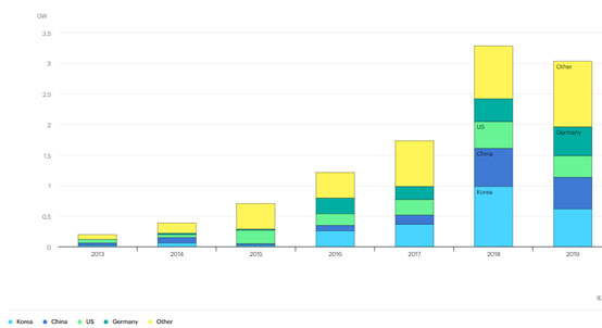 韓國的年裝機(jī)容量在2018年創(chuàng)下紀(jì)錄后下降了80%,當(dāng)時(shí)韓國占全球儲(chǔ)能裝機(jī)容量的三分之一。下降的原因是人們越來越擔(dān)心2018年電網(wǎng)規(guī)模的儲(chǔ)能工廠發(fā)生的幾起火災(zāi)。盡管對火災(zāi)和安全措施進(jìn)行了大規(guī)模審查,但2019年又發(fā)生了5起火災(zāi)。