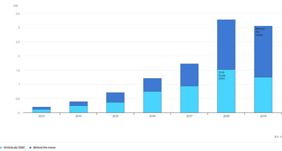 2019年,全球電力系統(tǒng)新增了2.9 GW的儲(chǔ)能容量,比2018年減少了近30%。這一趨勢背后的因素表明,儲(chǔ)能技術(shù)在很大程度上仍處于早期階段,目前只存在于少數(shù)幾個(gè)關(guān)鍵市場,嚴(yán)重依賴政策支持。