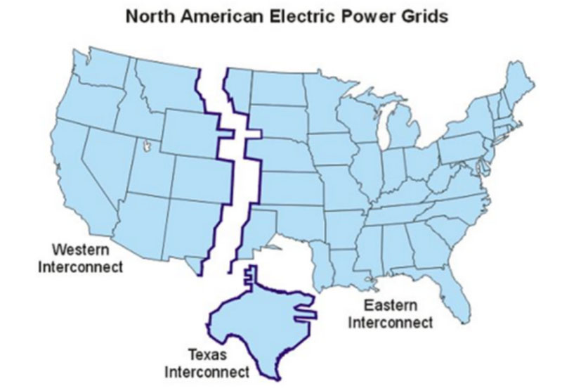 美國電網(wǎng)由三大電網(wǎng)(Larger electricity networks)組成,分別是Western Interconnect、Eastern Interconnect,和Texas Interconnect,覆蓋48個州。基于商業(yè)性和穩(wěn)定性的考慮,三大電網(wǎng)彼此獨立運行,很少進行電能交換。其分布如下圖所示: