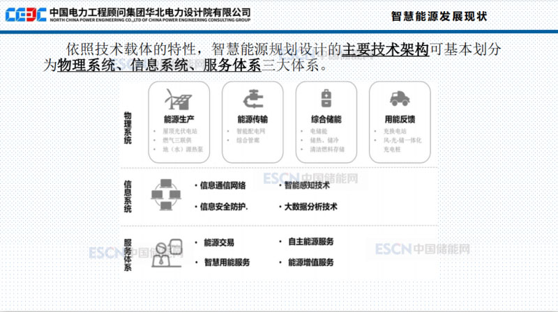 接下來我們來看智慧能源規(guī)劃設(shè)計的主要技術(shù)架構(gòu),分為三個部分:物理系統(tǒng)、信息系統(tǒng)、服務(wù)體系。