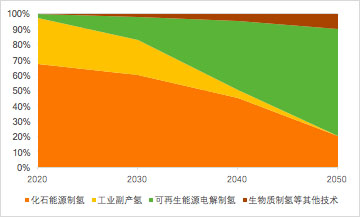 在中國氫能聯(lián)盟發(fā)布的《氫能源及燃料電池白皮書》中,預測隨著我國能源結構由化石能源為主轉向以可再生能源為主的格局,氫氣供給結構中可再生能源電解水的比例也將大幅增長,到2050年占比70%。