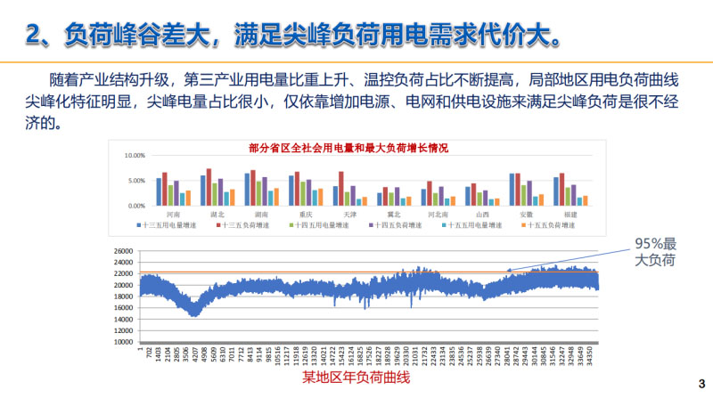 2、從電力系統(tǒng)建設(shè)和運(yùn)營(yíng)經(jīng)濟(jì)性的角度,未來(lái)負(fù)荷中心的峰谷差呈現(xiàn)逐漸增大的趨勢(shì),通過(guò)下面的柱狀圖看到無(wú)論是十三五還是十四五、十五五的預(yù)測(cè)當(dāng)中,負(fù)荷的增速都是大于用電量的增速,負(fù)荷特性尖峰化的特征越來(lái)越明顯,尖峰電量占比很少,對(duì)于這部分尖峰負(fù)荷的供電,僅僅依靠增加電源、電網(wǎng)和供電設(shè)施來(lái)滿(mǎn)足對(duì)電網(wǎng)的建設(shè)還是很不經(jīng)濟(jì)的。下面是某負(fù)荷中心的年負(fù)荷曲線(xiàn),如果按95%最大負(fù)荷劃線(xiàn)的話(huà)超過(guò)95%的負(fù)荷是很少的。