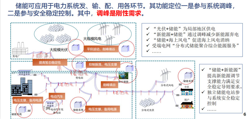 二、來(lái)看一下儲(chǔ)能在電網(wǎng)當(dāng)中的應(yīng)用,首先在穩(wěn)態(tài)功率平衡當(dāng)中的應(yīng)用,儲(chǔ)能就像保溫瓶,這樣的東西在電網(wǎng)的哪個(gè)環(huán)節(jié)不需要?所以可以說(shuō)在發(fā)、輸、配、用各個(gè)環(huán)節(jié)都需要的,調(diào)峰是剛性需要的。光伏+儲(chǔ)能、風(fēng)電+儲(chǔ)能、新能源+儲(chǔ)能都是常見(jiàn)的場(chǎng)景。