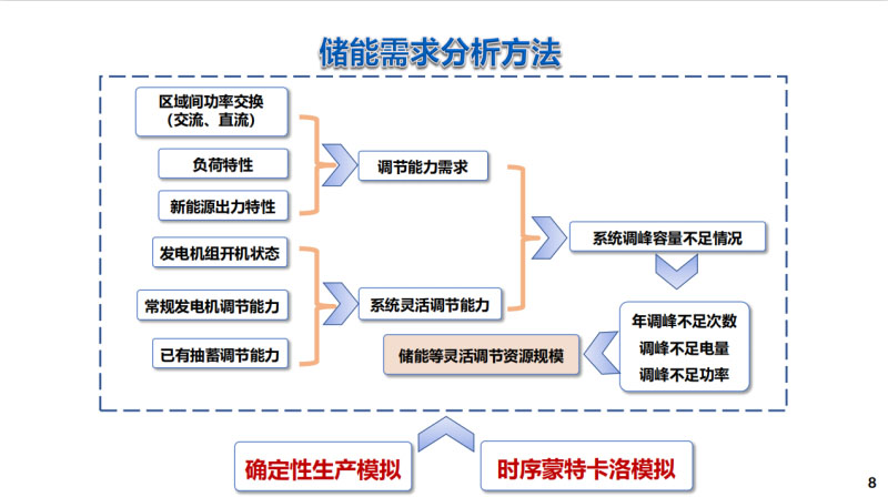 在儲(chǔ)能滿(mǎn)足系統(tǒng)調(diào)峰需求方面,要確定儲(chǔ)能的需求容量和布局,在這方面主要是采用時(shí)序生產(chǎn)模擬的方法,一是通過(guò)確定性的生產(chǎn)模擬,另外是將隨機(jī)性引入進(jìn)來(lái)的模擬,要確定電網(wǎng)對(duì)于儲(chǔ)能的需求,可以通過(guò)區(qū)域間的功率交換的特性,負(fù)荷特性,新能源出力特性,得到調(diào)節(jié)能力的需求;通過(guò)發(fā)電機(jī)組開(kāi)機(jī)狀態(tài)、常規(guī)發(fā)電機(jī)調(diào)節(jié)能力、已有抽蓄調(diào)節(jié)能力得到系統(tǒng)靈活調(diào)節(jié)能力,最后得到系統(tǒng)調(diào)峰容量不足的情況。