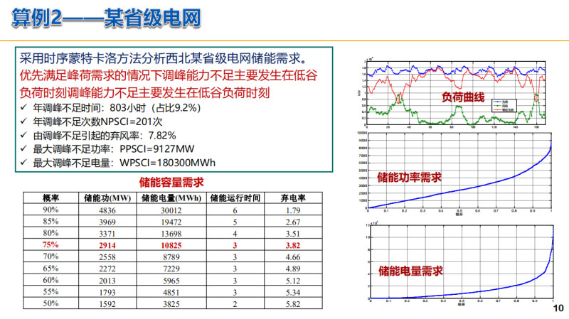 剛才這種方法是基于確定性的方法,把一年的風(fēng)電和光伏的曲線(xiàn)進(jìn)行持續(xù)的模擬,畢竟風(fēng)電和光伏是隨機(jī)性的,所以說(shuō)可以引入考慮隨機(jī)性的模擬方法,對(duì)多年的風(fēng)資源的特性和光資源特性進(jìn)行模擬,這樣得到儲(chǔ)能的配比更具有可行性。這里也是以西北某省級(jí)電網(wǎng)做了一個(gè)算例,可以得到一年當(dāng)中調(diào)峰不足的時(shí)間,次數(shù),產(chǎn)生的棄風(fēng)率是多少,電量是多少。