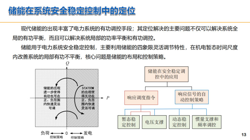 儲(chǔ)能的出現(xiàn)其實(shí)是豐富了電力系統(tǒng)的有功調(diào)控手段,不僅可以解決全局的有功平衡,也可以解決局部的功率平衡和有功調(diào)控。我們說(shuō)儲(chǔ)能具有四象限的靈活調(diào)節(jié)特性,是在有功和無(wú)功的坐標(biāo)系下,儲(chǔ)能可以在這四個(gè)象限運(yùn)行,可以充可以放,所以說(shuō)是非常靈活的調(diào)節(jié)手段,他在電力系統(tǒng)安全穩(wěn)定中的應(yīng)用,大概可以分為兩類(lèi),一是響應(yīng)電氣量信號(hào),提高穩(wěn)定性,進(jìn)行電壓支撐等;另外就是響應(yīng)調(diào)度指令,應(yīng)用到電力系統(tǒng)的安控當(dāng)中。