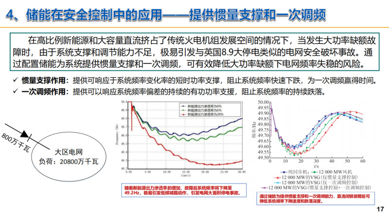 4、提供慣量支撐和一次調(diào)頻,在高比例的新能源和大容量直流擠占了傳統(tǒng)火電機(jī)組發(fā)展空間的情況下,當(dāng)發(fā)生大功率缺額故障的時(shí)候,存在引發(fā)系統(tǒng)穩(wěn)定破壞的風(fēng)險(xiǎn),如果配置儲(chǔ)能為系統(tǒng)提供一次調(diào)頻和慣量支撐可以有效降低這種風(fēng)險(xiǎn)。儲(chǔ)能在提供慣量支撐主要是提供響應(yīng)于系統(tǒng)頻率變化的短時(shí)功率支撐,阻止系統(tǒng)頻率快速下跌,為一次調(diào)頻贏得時(shí)間,在一次調(diào)頻方面是響應(yīng)系統(tǒng)頻率偏差,阻止系統(tǒng)頻率的持續(xù)跌落。以一個(gè)大區(qū)電網(wǎng)為例,如果特高壓直流、雙級(jí)故障損失800萬(wàn)千瓦,大區(qū)電網(wǎng)中新能源出力滲透率增加到28%時(shí),故障后系統(tǒng)頻率將下降到49.2赫茲,容易引發(fā)低頻減載的動(dòng)作,引發(fā)電網(wǎng)大面積停電。如果利用儲(chǔ)能提供慣量和一次調(diào)頻,能夠相當(dāng)于把新能源替換成常規(guī)同步機(jī)的效果,可以減少頻率的跌落。