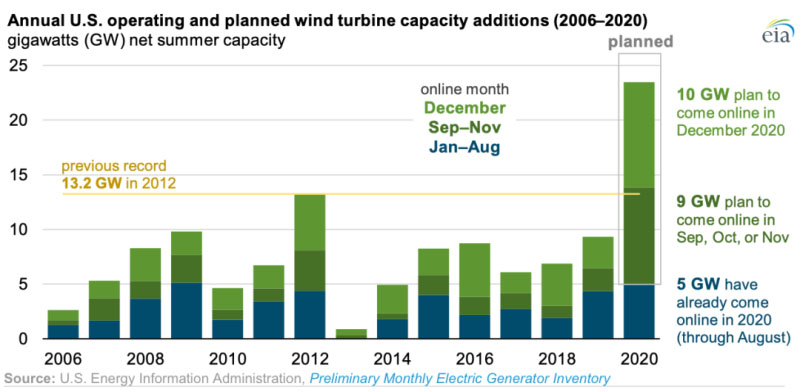 美國(guó)對(duì)可再生能源的生產(chǎn)稅抵免(PTC)優(yōu)惠在2020年底起逐步取消,這將導(dǎo)致今年的新增風(fēng)電超過(guò)平均水平。根據(jù)美國(guó)能源信息署(EIA)收集的數(shù)據(jù),預(yù)計(jì)2020年美國(guó)有超過(guò)23吉瓦(GW)的風(fēng)力渦輪機(jī)發(fā)電容量并網(wǎng),這遠(yuǎn)遠(yuǎn)超過(guò)了此前2012年創(chuàng)下的13.2 吉瓦的記錄。今年前8個(gè)月只有5.0GW的容量并網(wǎng),其余18.5GW計(jì)劃在9月至12月并網(wǎng)。在過(guò)去的10年中,每年增加的風(fēng)電裝機(jī)量的41%在12月并網(wǎng)。